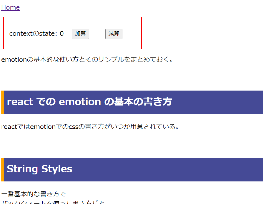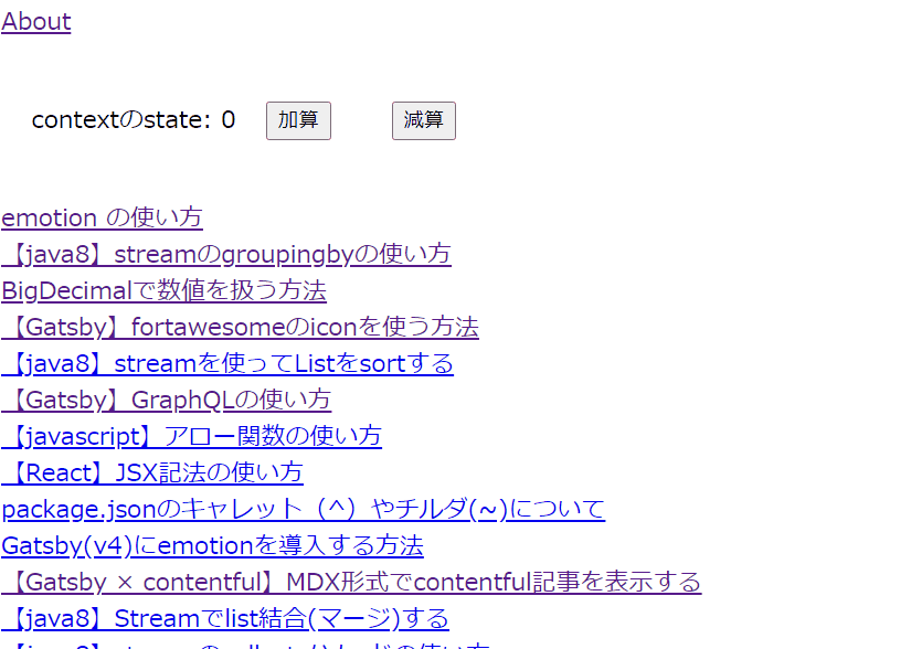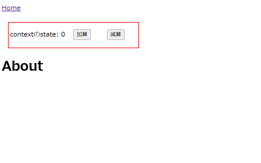 import * as React from "react"import { Link, graphql } from "gatsby"import { useSampleContext } from "../context"import { css } from "@emotion/react"const About = ({ data }) => {//共有しているstateと関数を取得const { count, add, substract } = useSampleContext()return (<div><Link to="/">Home</Link>{/* 共有stateの表示と更新ボタン */}<div css={[btnStyle]}>contextのstate: {count}<button onClick={add} css={[btnStyle]}>加算</button><button onClick={substract} css={[btnStyle]}>減算</button></div><h1>About</h1></div>)}export default Aboutconst btnStyle = () => [css`margin: 20px;`,]